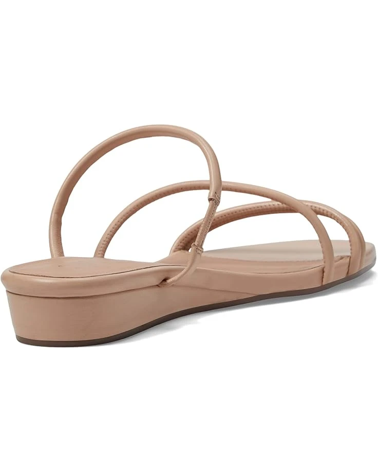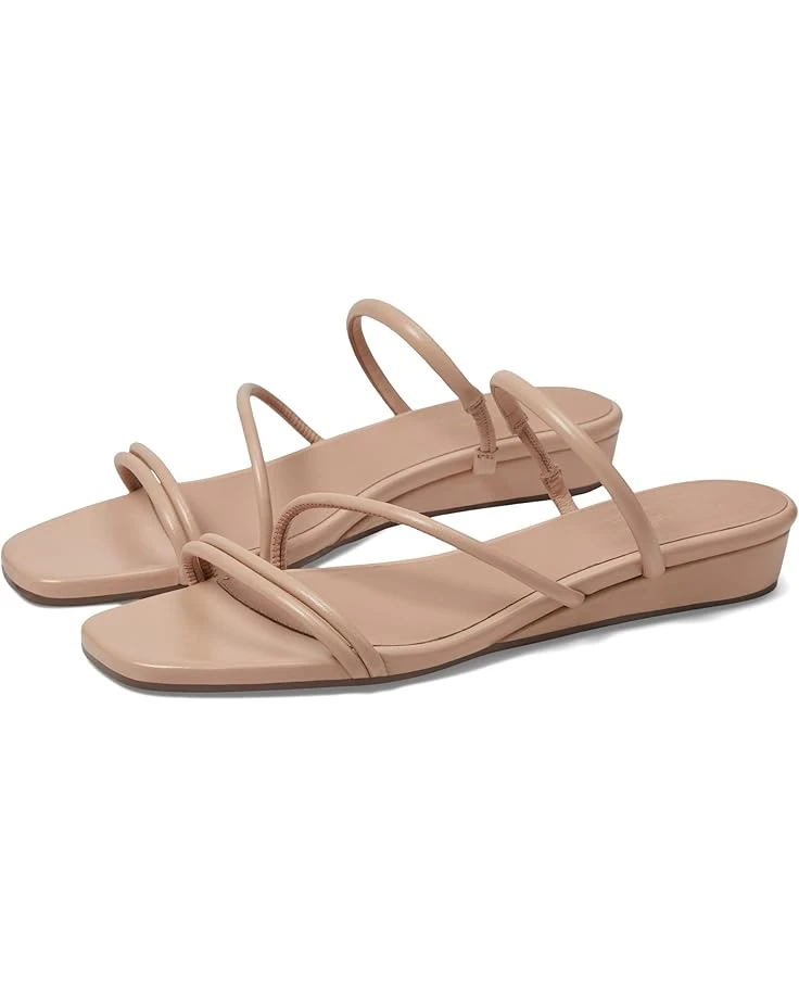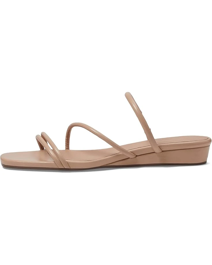 Strappy, gold sandals with clean lines and barely there heel. Unfortunately, cheaply constructed with too-narrow straps,, rough seams at instep, too little padding and too stiff sole.