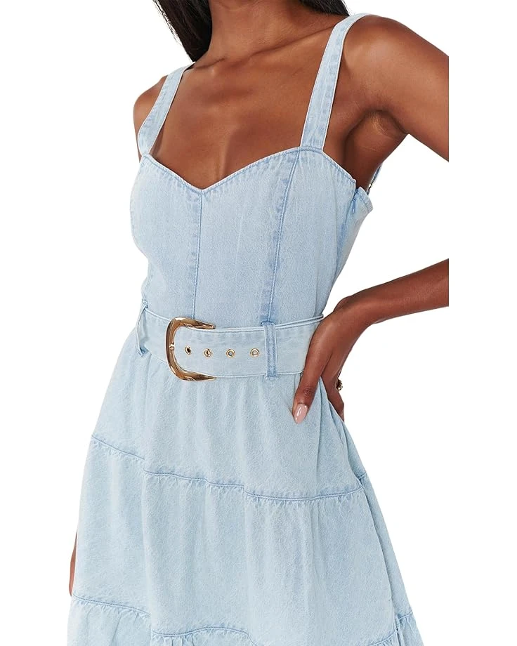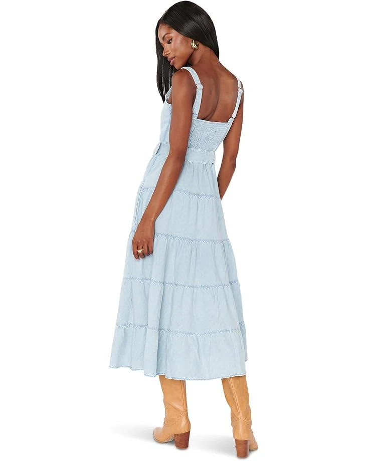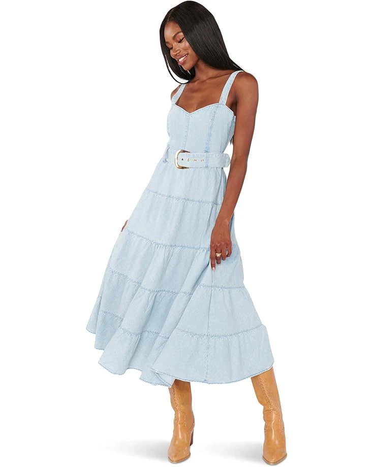 - Be the epitome of style, and fashion wearing the Show Me Your Mumuâ„¢ Lainey Midi Dress. This midi length, flowy denim dress has a fitted bodice with a smocked back and the skirt is tiered. Has a matching belt and pockets. What’s not to love? It comes with sweetheart neckline, sleeveless style, back zippered closure, and pull-on style.