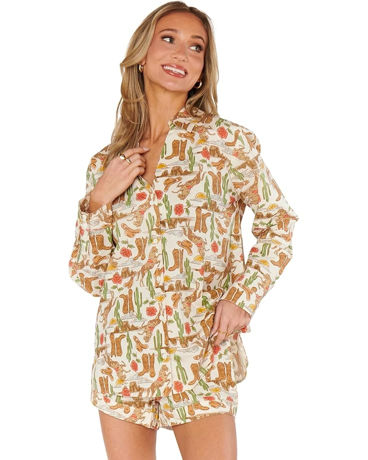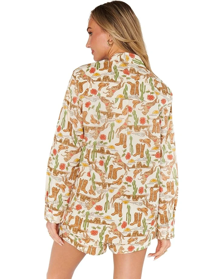 - Bed meets babe in this fashionable jammie set! Cozy cotton and its rodeo escape graphic elevate this set so you can take it from sheets to streets by simply swapping the shorts for your fave denim! The shirt features a collared neck, button-down closure on the front, long sleeves, and allover printed details. The matching shorts come with an elasticated waist for a comfortable fit.